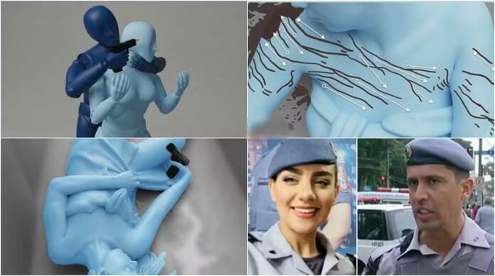 6) O sangue escorreu pelo ombro de Gisele e mudou de direção quando o corpo foi colocado no chão, passando a atingir a região do peito