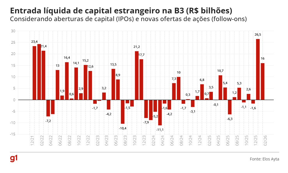 Diante desse cenário, é possível dizer que a fase de forte valorização da bolsa brasileira chegou ao fim? Para especialistas ouvidos pelo g1, a entrada de capital estrangeiro ainda pode continuar ao longo de 2026, mas o ritmo deve depender do cenário internacional.