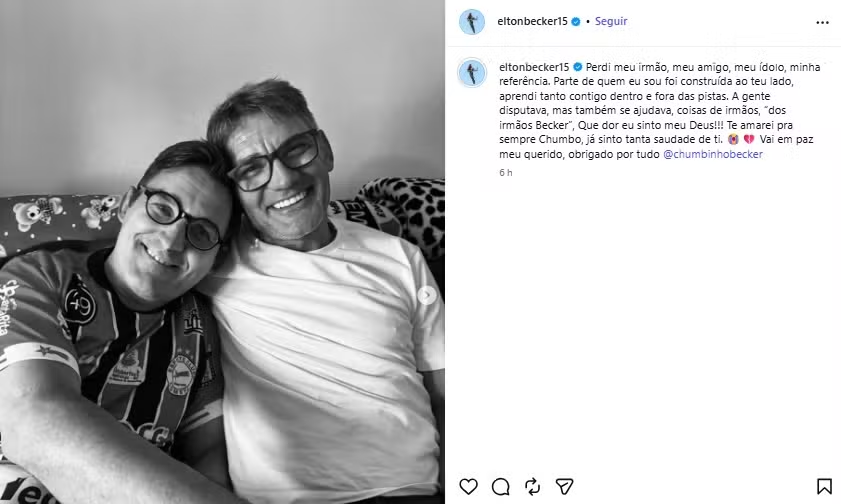 “Perdi meu irmão, meu amigo, meu ídolo, minha referência. Parte de quem eu sou foi construída ao teu lado, aprendi tanto contigo dentro e fora das pistas. A gente disputava, mas também se ajudava, coisas de irmãos, “dos irmãos Becker”, Que dor eu sinto meu Deus!!! Te amarei pra sempre Chumbo, já sinto tanta saudade de ti. Vai em paz meu querido, obrigado por tudo @chumbinhobecker”.