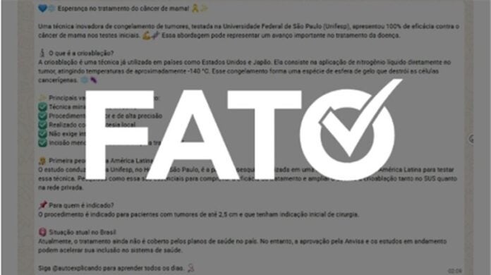 Post cita estudo da Universidade Federal de São Paulo sobre crioablação. Ao Fato ou Fake, professor confirmou alegação e fez complementos ao texto da mensagem.