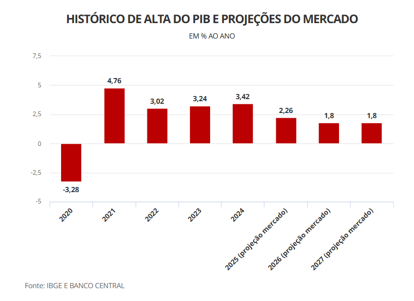 Para o crescimento do Produto Interno Bruto (PIB) de 2025, cujo resultado também não foi divulgado pelo IBGE até então, a estimativa do mercado foi mantida em uma alta 2,26% na semana passada.