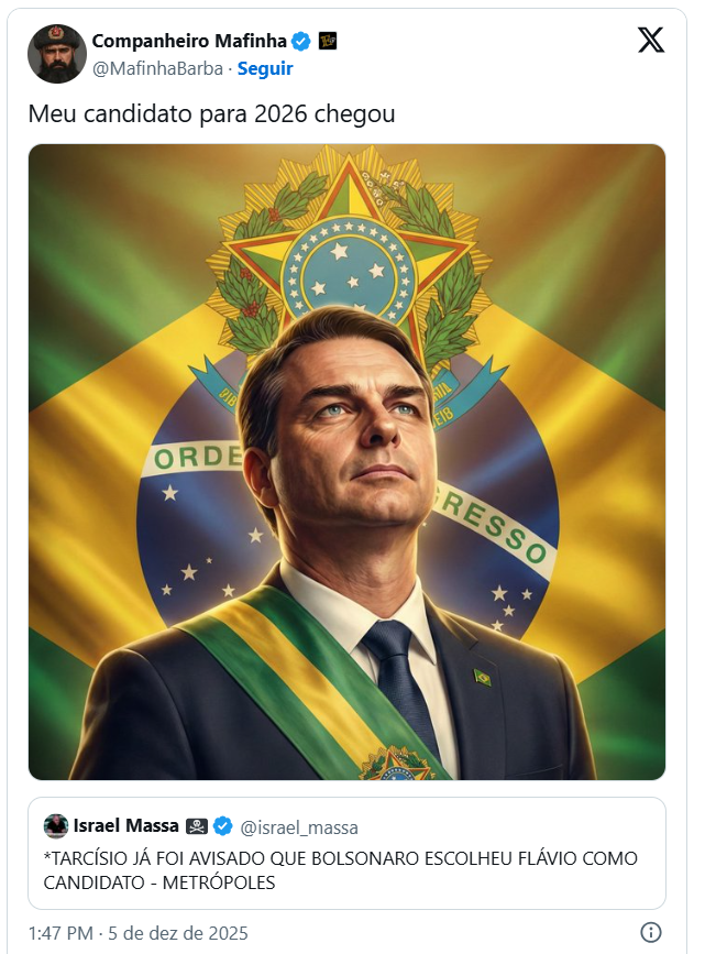 Nas redes sociais, perfis ligados ao círculo mais fiel ao ex-presidente celebraram a indicação. “Meu candidato para 2026 chegou”, publicou um apoiador, acompanhado de uma imagem em inteligência artificial de Flávio com a faixa presidencial. “Flávio Bolsonaro no primeiro turno. E sendo bolsonarista tem de seguir os passos do capitão. Ele falou, está falado”, afirmou outro. O ex-secretário de Comunicação do governo Bolsonaro, Fábio Wajngarten, comentou que “toda e qualquer decisão do ex-presidente é soberana”.