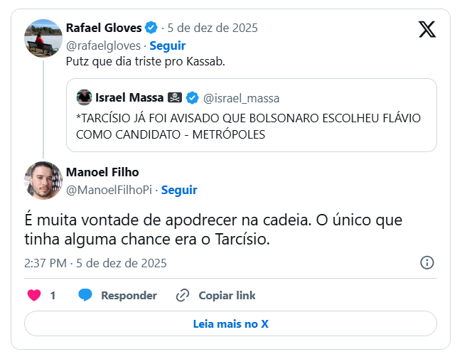 O impacto político e econômico da escolha também foi comentado. Um apoiador destacou que a movimentação deve influenciar o mercado, lembrando que o “Trade Tarcísio” tem sido o principal motor da alta da Bolsa e da queda do dólar nos últimos meses. Outro lembrou que muitos viam Tarcísio como o único nome competitivo. “É muita vontade de apodrecer na cadeia. O único que tinha alguma chance era o Tarcísio”, disse.