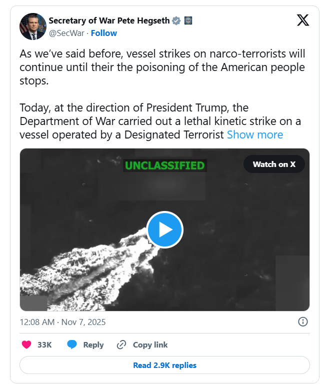 “Como já dissemos antes, os ataques a embarcações contra narco-terroristas continuarão até que o envenenamento do povo americano cesse”, escreveu Hegseth em uma rede social.