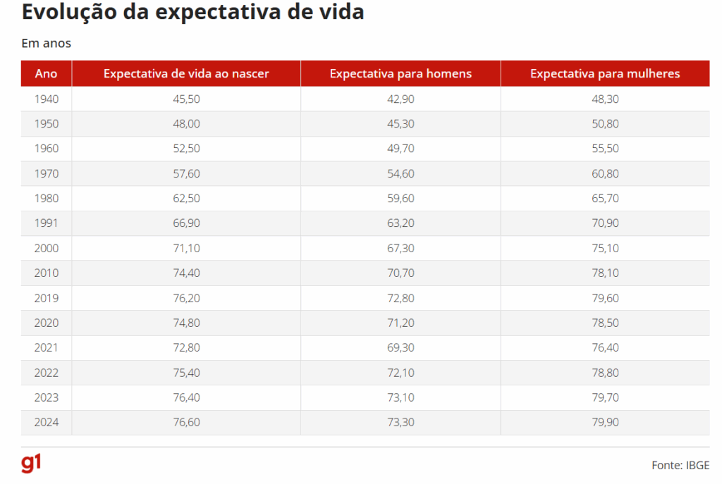Segundo o IBGE, a longevidade da população brasileira aumentou 31,1 anos nas últimas nove décadas, de 45,5 anos em 1940 para 76,6 anos em 2024.