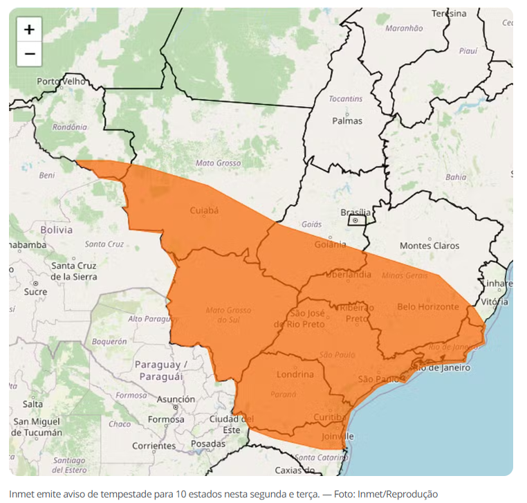 O aviso laranja inclui todo o Mato Grosso do Sul e o Rio de Janeiro, parte de Mato Grosso, Goiás, Minas Gerais, São Paulo, Paraná e Santa Catarina, além do sul do Espírito Santo e o extremo leste de Rondônia, como mostra o mapa abaixo.