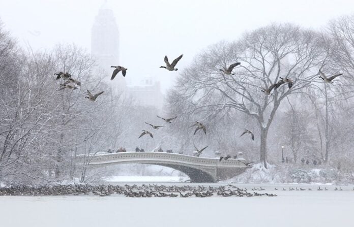 Pessoas caminham no Central Park, em Nova York, em meio a uma nevasca que cobriu a cidade na manhã de 27 de dezembro de 2025 — Foto: AFP