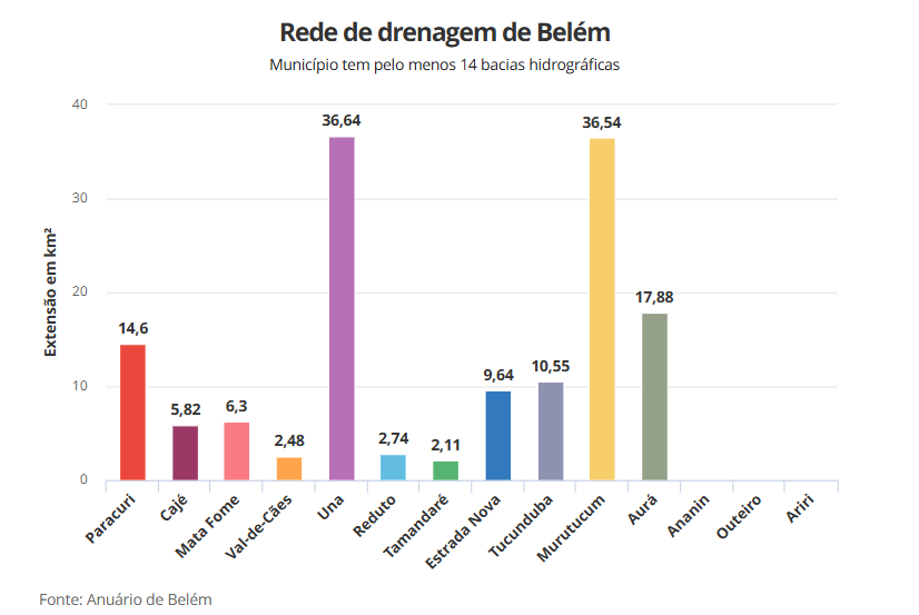 De acordo com o Anuário de Belém, há pelo menos 14 bacias hidrográficas que abrangem 41 bairros. A maior delas, a do Una, com 36,64 km², agrupa o maior número de bairros.
