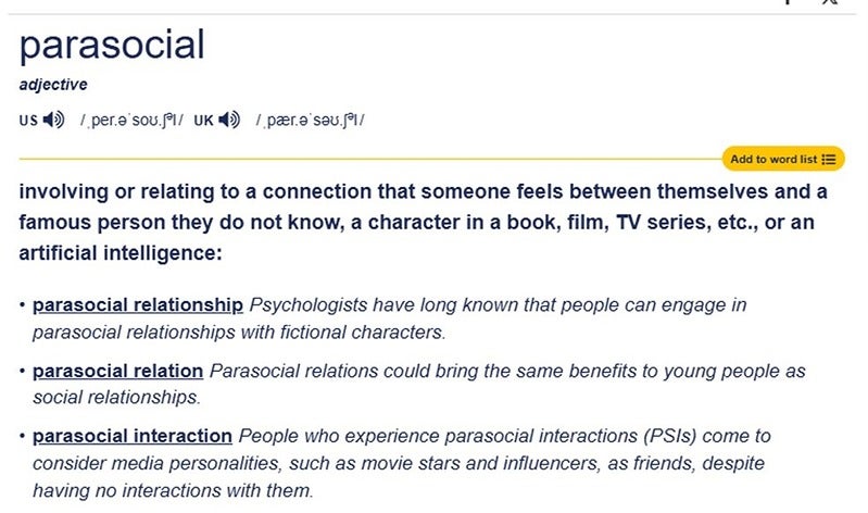 O termo é definido pelo dicionário como “uma relação que alguém experimenta com uma pessoa famosa que não conhece, um personagem de livro, filme ou série de TV, etc., ou uma inteligência artificial”.