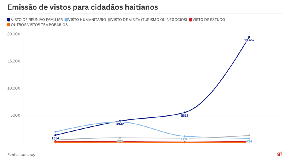 Informações do Ministério das Relações Exteriores revelam que o número de vistos emitidos em favor de cidadãos haitianos tem crescido ano a ano, sendo o mais expressivo deles o de reunião familiar, que aumentou 252,9% somente entre 2024 e 2025 – veja gráfico abaixo.