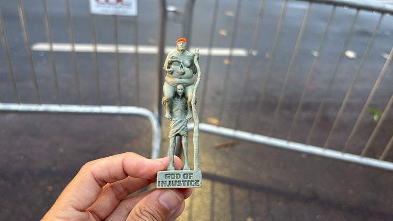 A escultura retrata Trump segurando uma balança — símbolo de sua autodeclarada autoridade moral — e um taco de golfe apoiado em um globo terrestre, sugerindo controle e desprezo pelo futuro climático do planeta, na visão do artista.