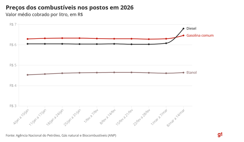 Em meio a uma severa alta dos preços do petróleo por conta da guerra no Oriente Médio, o preço médio do litro do diesel nos postos de combustíveis do país subiu mais de 11%, mostram dados da Agência Nacional do Petróleo, Gás Natural e Biocombustíveis (ANP) divulgados nesta sexta-feira (13).
