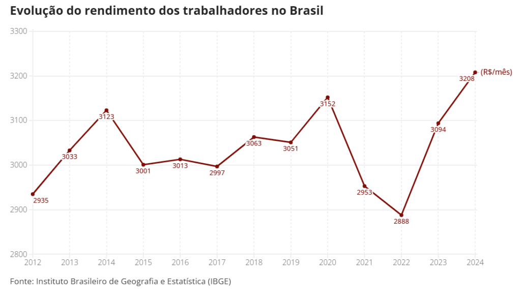O rendimento médio de todas as fontes dos brasileiros atingiu R$ 3.208 em 2024, segundo o Instituto Brasileiro de Geografia e Estatística (IBGE). Esse é o maior valor já registrado na série histórica, iniciada em 2012.