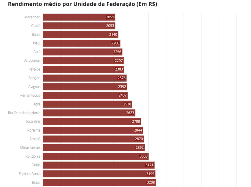 - Na outra ponta, Maranhão (R$ 2.051) e Ceará (R$ 2.053) têm os menores valores.