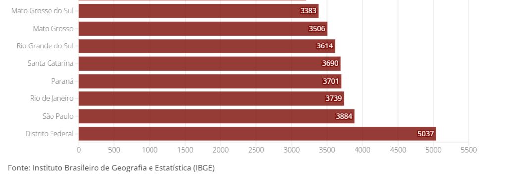 - O Distrito Federal lidera com R$ 5.037, seguido por São Paulo (R$ 3.884).