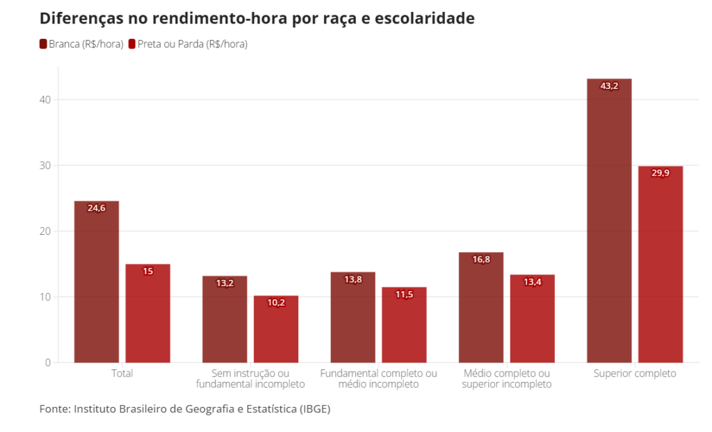 - No nível superior completo, a diferença entre brancos e pretos ou pardos chegava a 44,6%.