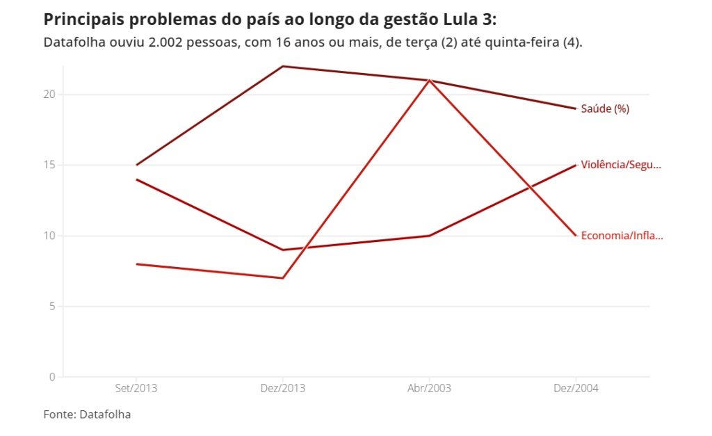 Ao longo da gestão Lula 3, o Datafolha mostra que a saúde se mantém como uma preocupação constante e dominante, oscilando entre 20% e 22% da população. Já a economia, que chegou a liderar em março de 2024 com cerca de 22%, perdeu força ao longo do segundo semestre, fechando dezembro próximo a 10% ou 11%.
