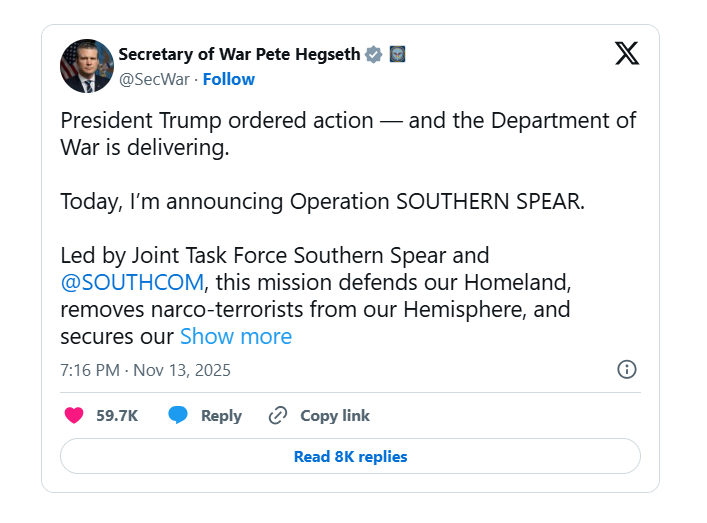 A declaração ocorre um dia após o secretário de Guerra dos EUA, Pete Hegseth, anunciar uma operação militar chamada ‘Lança do Sul’, que teria o objetivo de combater o que ele chamou de “narcoterroristas” e proteger o país das drogas.