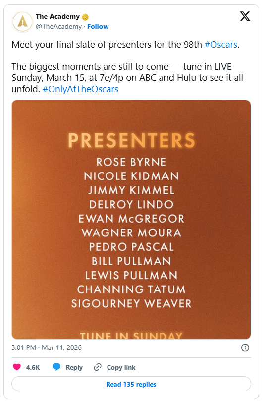 A cerimônia do Oscar 2026 acontece neste domingo. A TV Globo transmite a premiação a partir das 20h, e você também pode acompanhar a cobertura completa pelo g1.